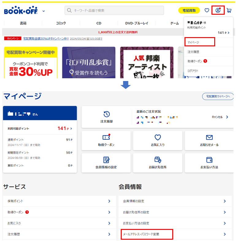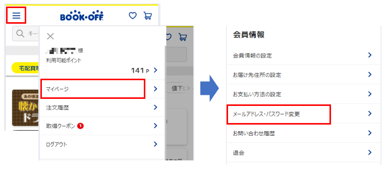 マイページの、「メールアドレスの追加と変更/パスワードの変更」から変更できます