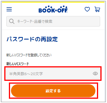 ⑦受信したメールのURLをクリック→新しいパスワードを入力→【設定する】ボタンを押下します