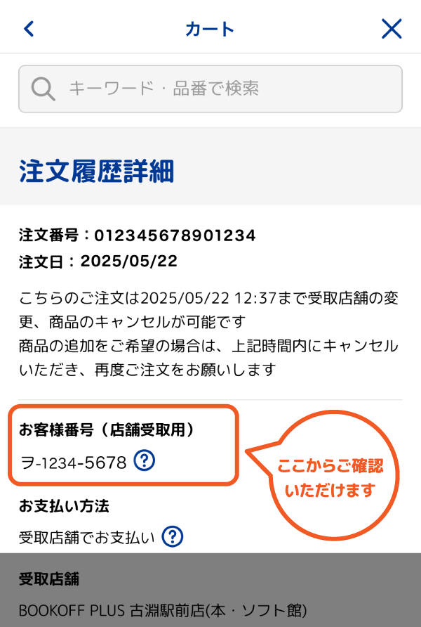 店舗受取サービスで商品お受取り時には「お客様番号」が必要です
