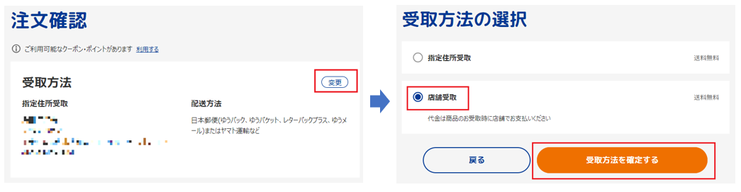 ①注文確認画面の受取方法の「変更」ボタンを押下します