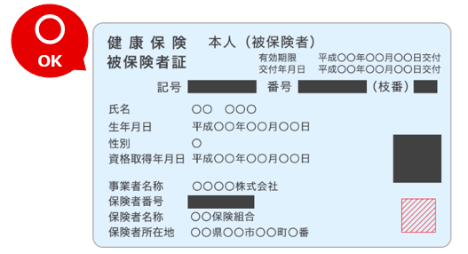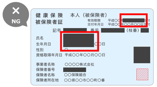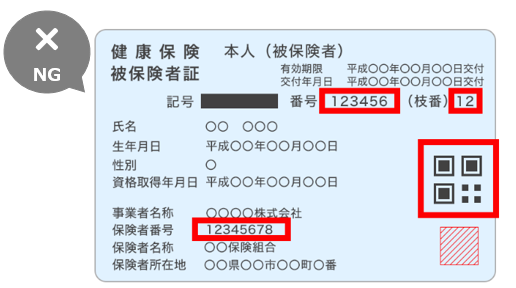 本人確認書類として健康保険証をご提出いただく際は、「保険者番号」「被保険者等記号・番号・枝番」「QRコード」をマスキングした状態(隠した状態)で撮影してください。