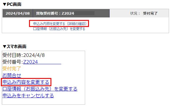 ②買取履歴・状況を開き、[申込内容を変更する]から、情報の変更をおこなってください